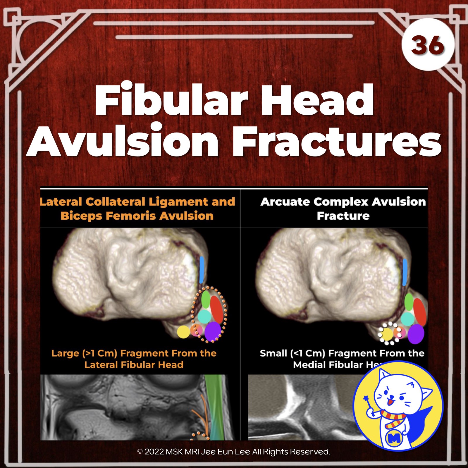 - Fractures resulting from avulsions of the LCL and biceps femoris tendon are larger and involve the lateral margin of the fibular head. (Rosenberg et al., 2016)