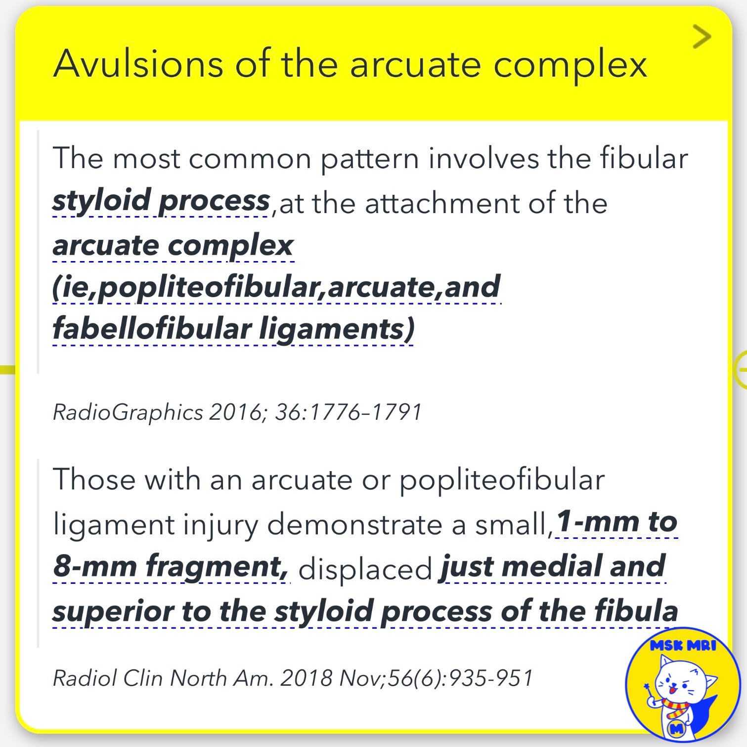 Introduction Certain osseous injuries, known as arcuate fractures or the arcuate sign, provide diagnostic clues for an underlying PLC injury, alerting radiologists to inspect this region closely. (Rosenberg et al., 2016)