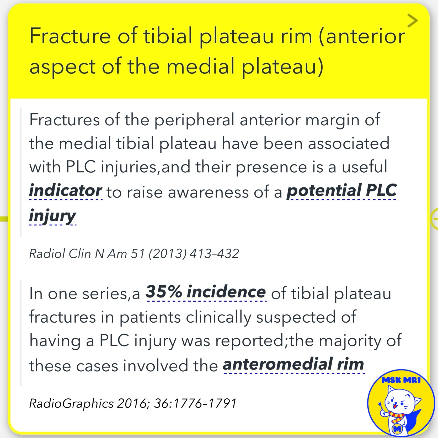 - Fractures of the peripheral anterior margin of the medial tibial plateau are associated with posterolateral corner (PLC) injuries and can serve as an important indicator of potential PLC injury.
