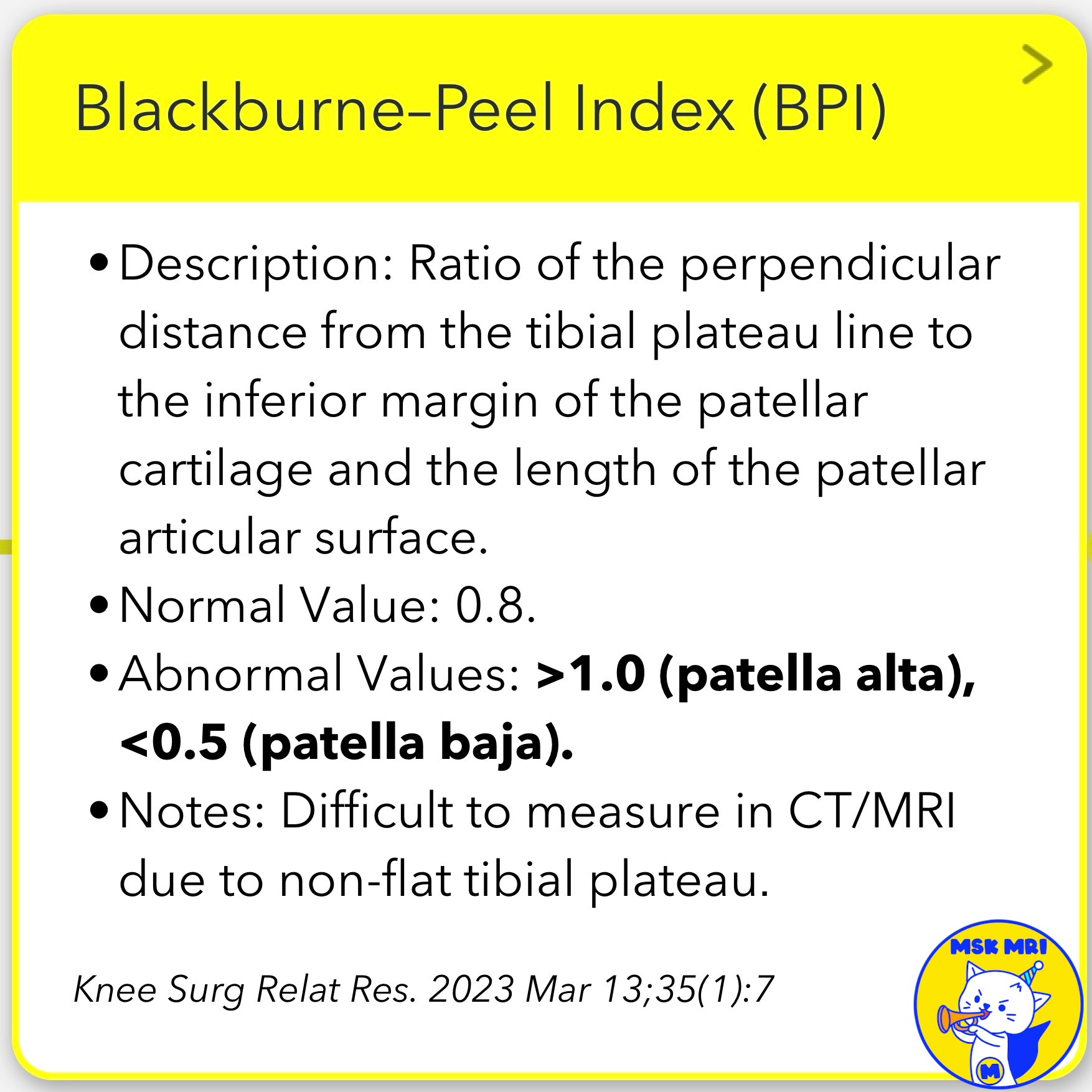 - Description: Ratio of the distance from the upper limit of the tibia to the distal end of the patellar cartilage and the length of the patellar articular surface.