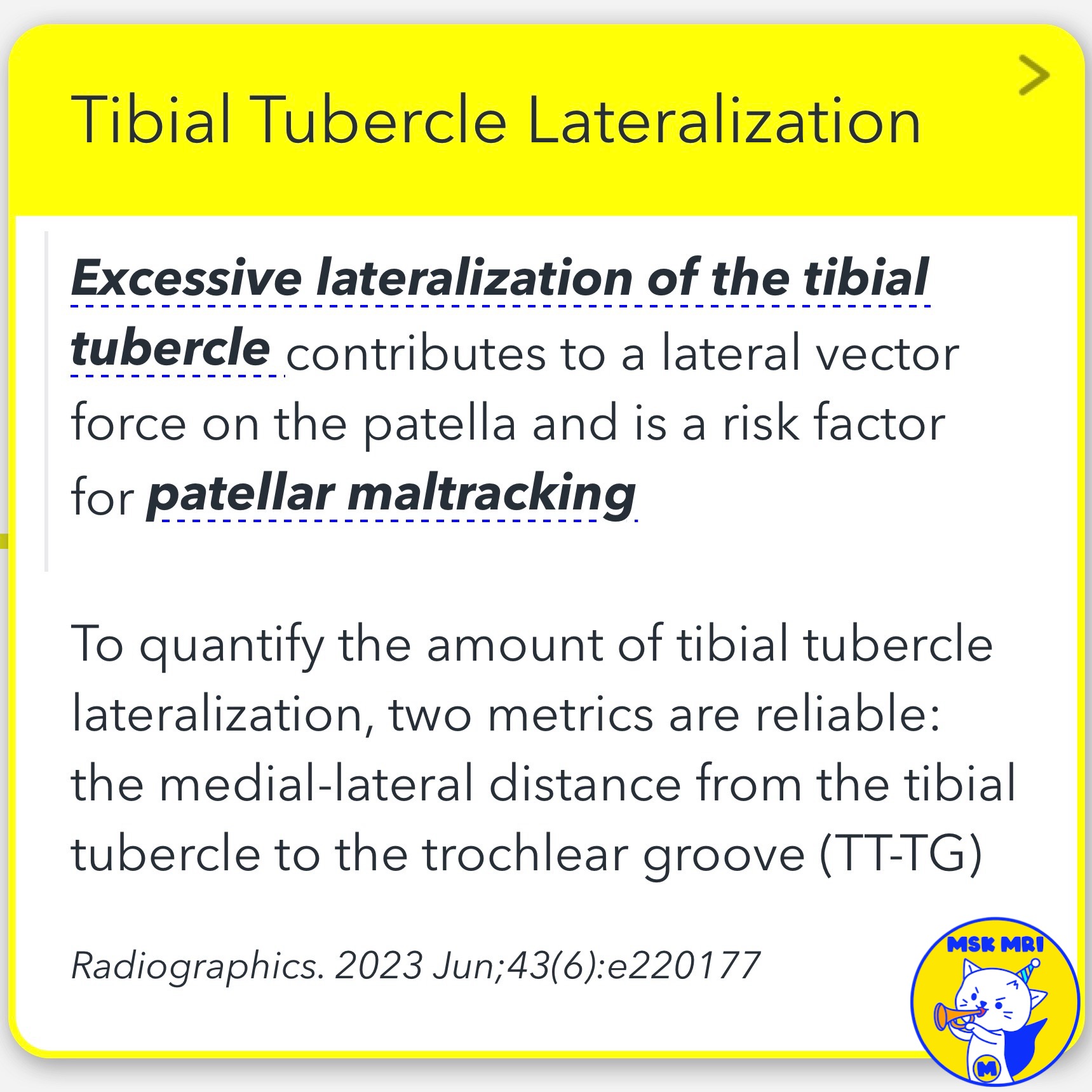 - Tibial tubercle lateralization is a factor in patellar maltracking. It is measured using TT-TG (Tibial Tubercle to Trochlear Groove) and TT-PCL (Tibial Tubercle to Posterior Cruciate Ligament).