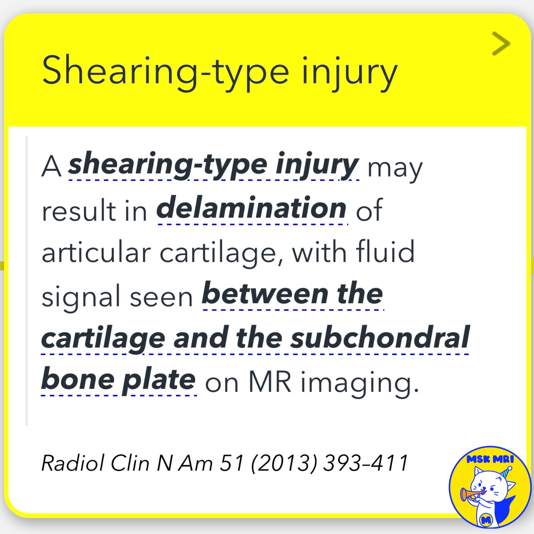 - A shearing-type injury can result in the delamination of articular cartilage, with fluid signal visible between the cartilage and the subchondral bone plate on MRI