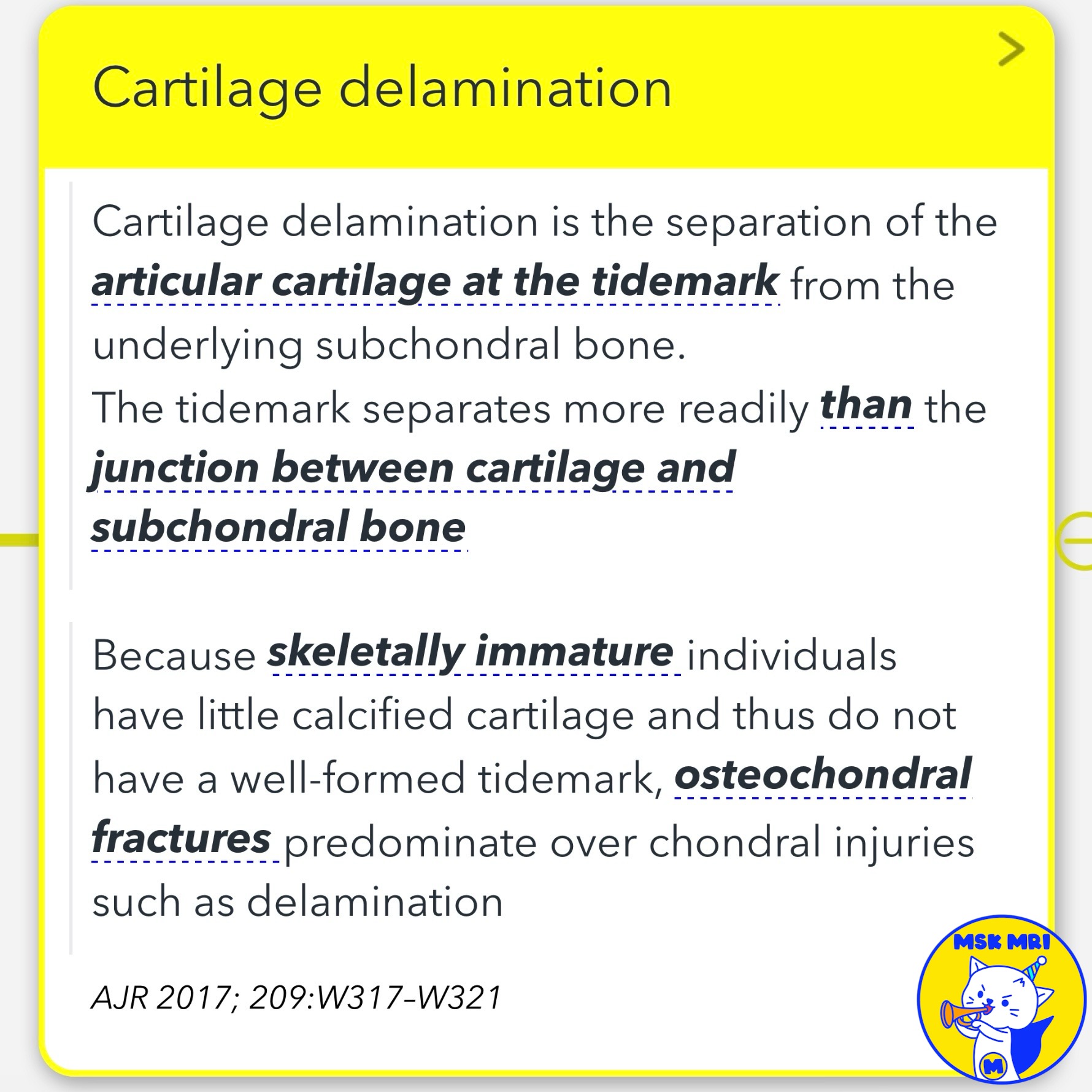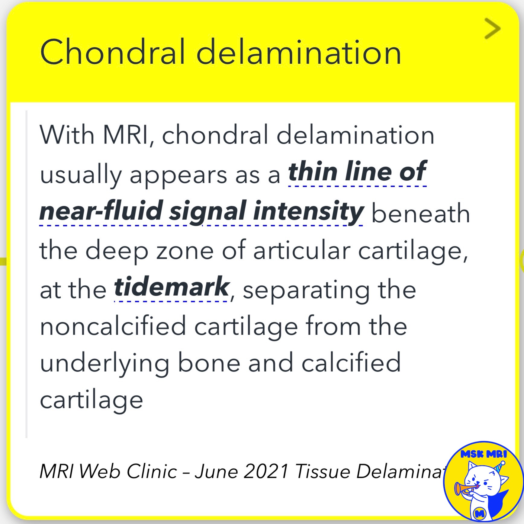 - Chondral delamination on MRI usually appears as a thin line of near-fluid signal intensity beneath the deep zone of articular cartilage, at the tidemark.