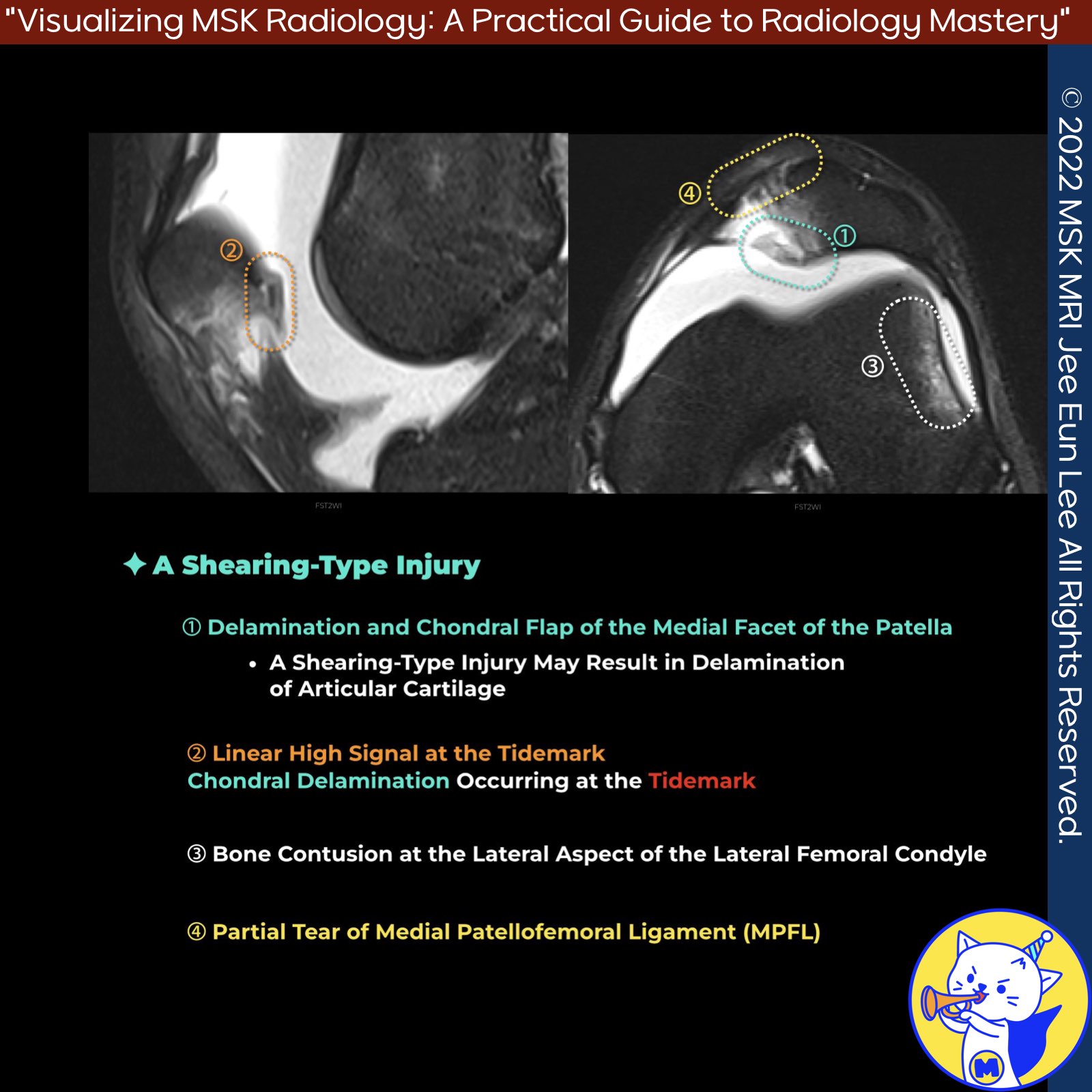 - Shearing injuries may also involve associated cartilage shearing injury and displaced osteochondral fragments, which can be found within the suprapatellar recess or medial and lateral recesses (Magn Reson Imaging Clin N Am 22, 2014, 601–620).