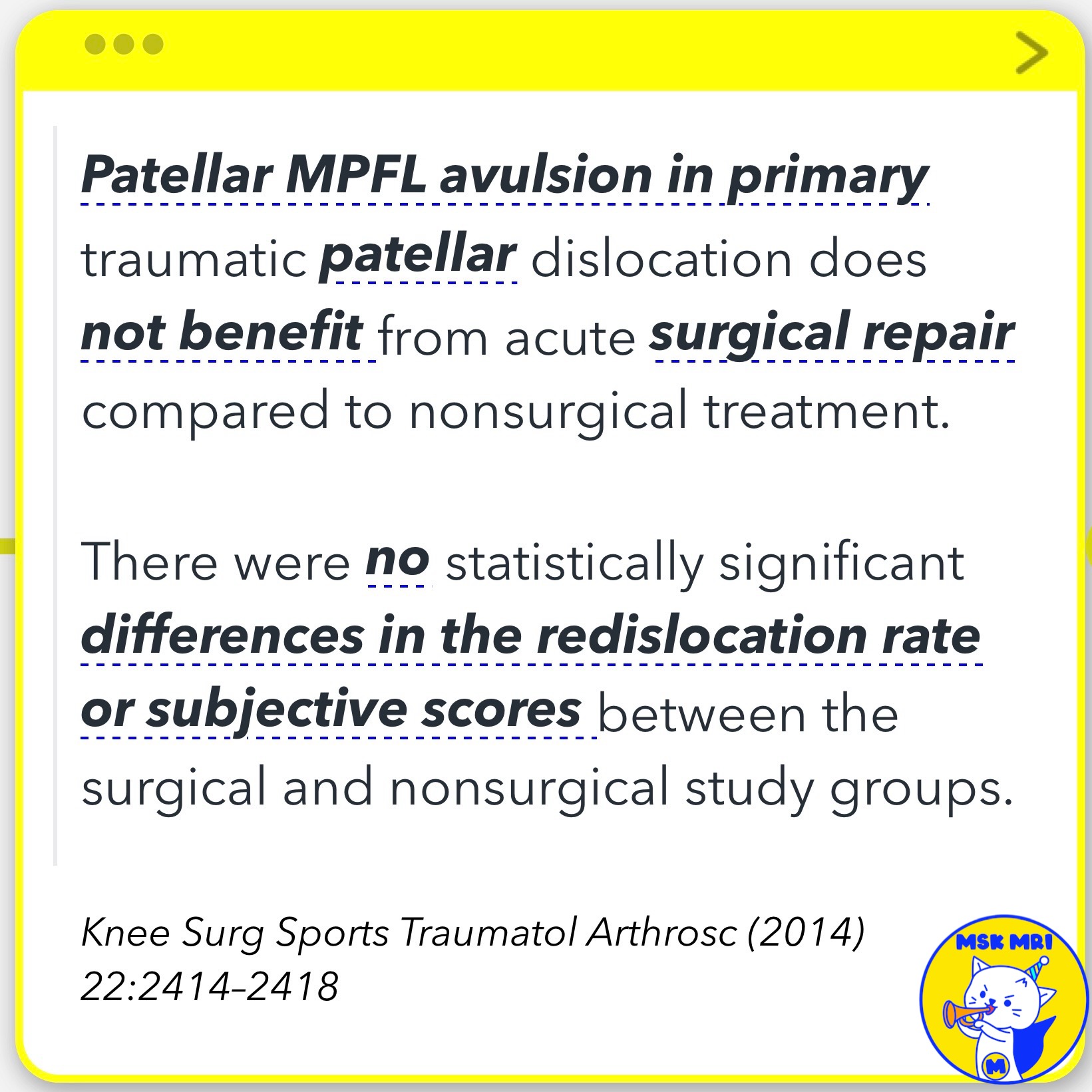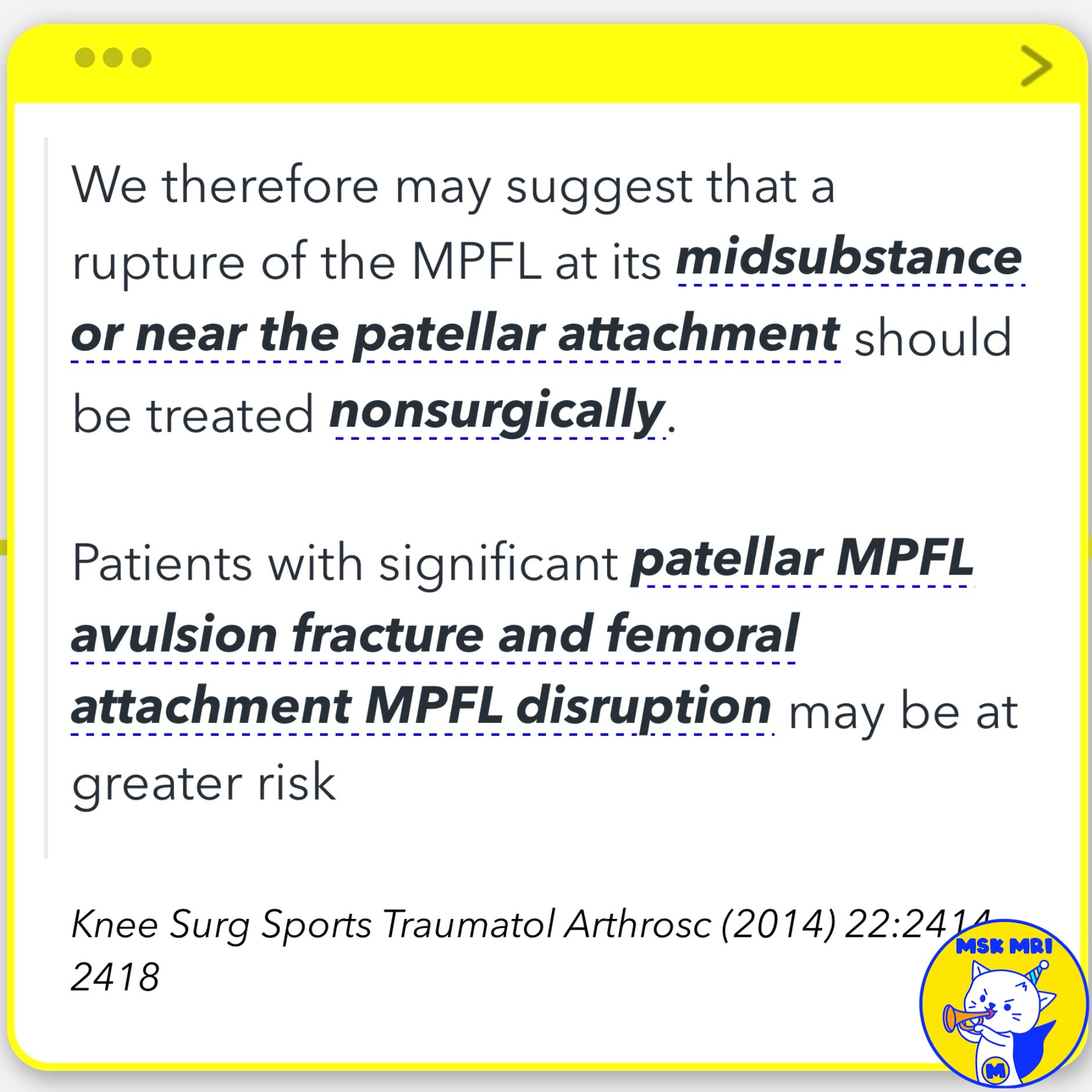 - Generally, MPFL ruptures at the midsubstance or near the patellar attachment are treated non-surgically.