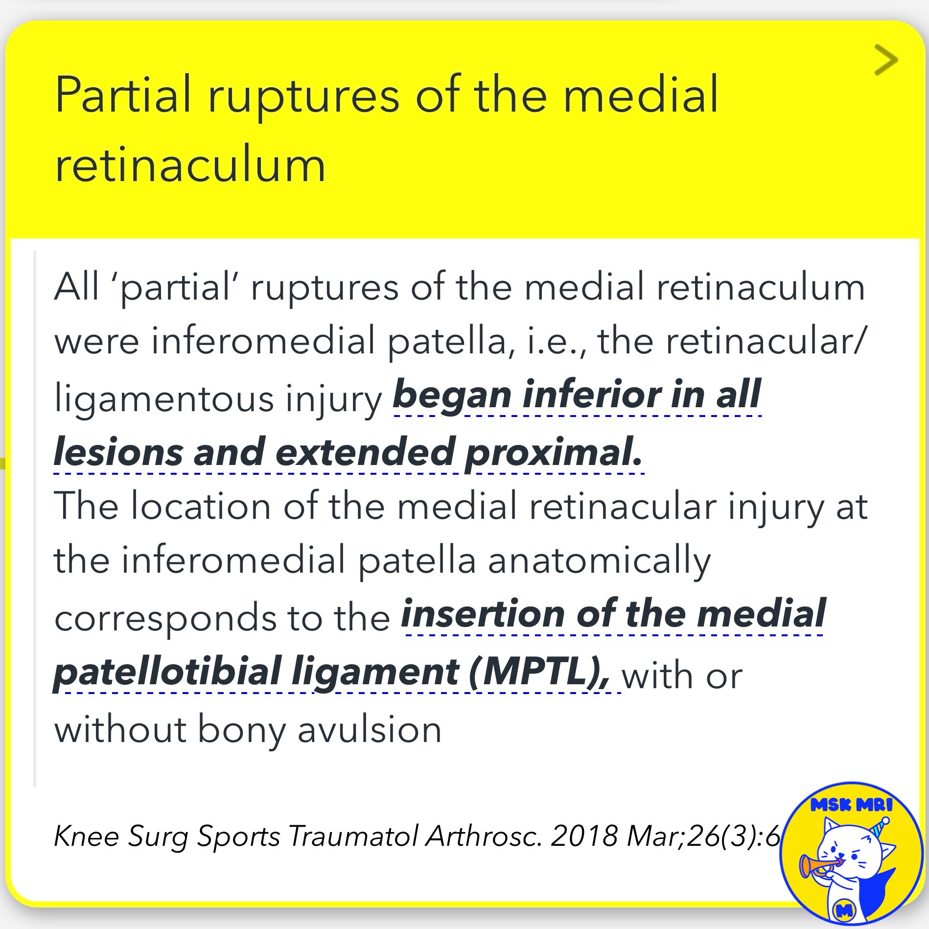 - The location of the medial retinacular injury at the inferomedial patella anatomically corresponds to the insertion of the medial patellotibial ligament (MPTL), with or without bony avulsion