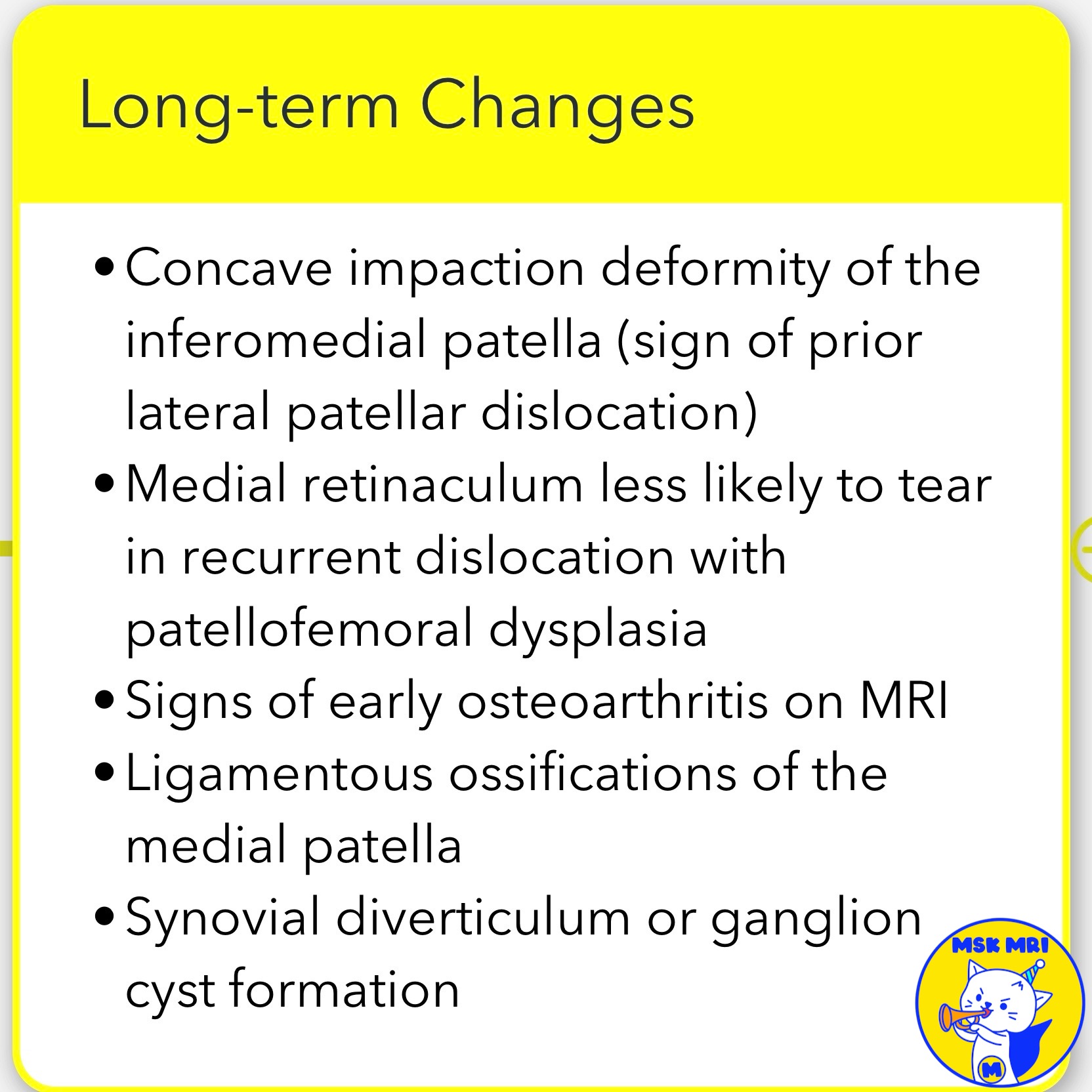 - Concave impaction deformity of the inferomedial patella (sign of prior lateral patellar dislocation)