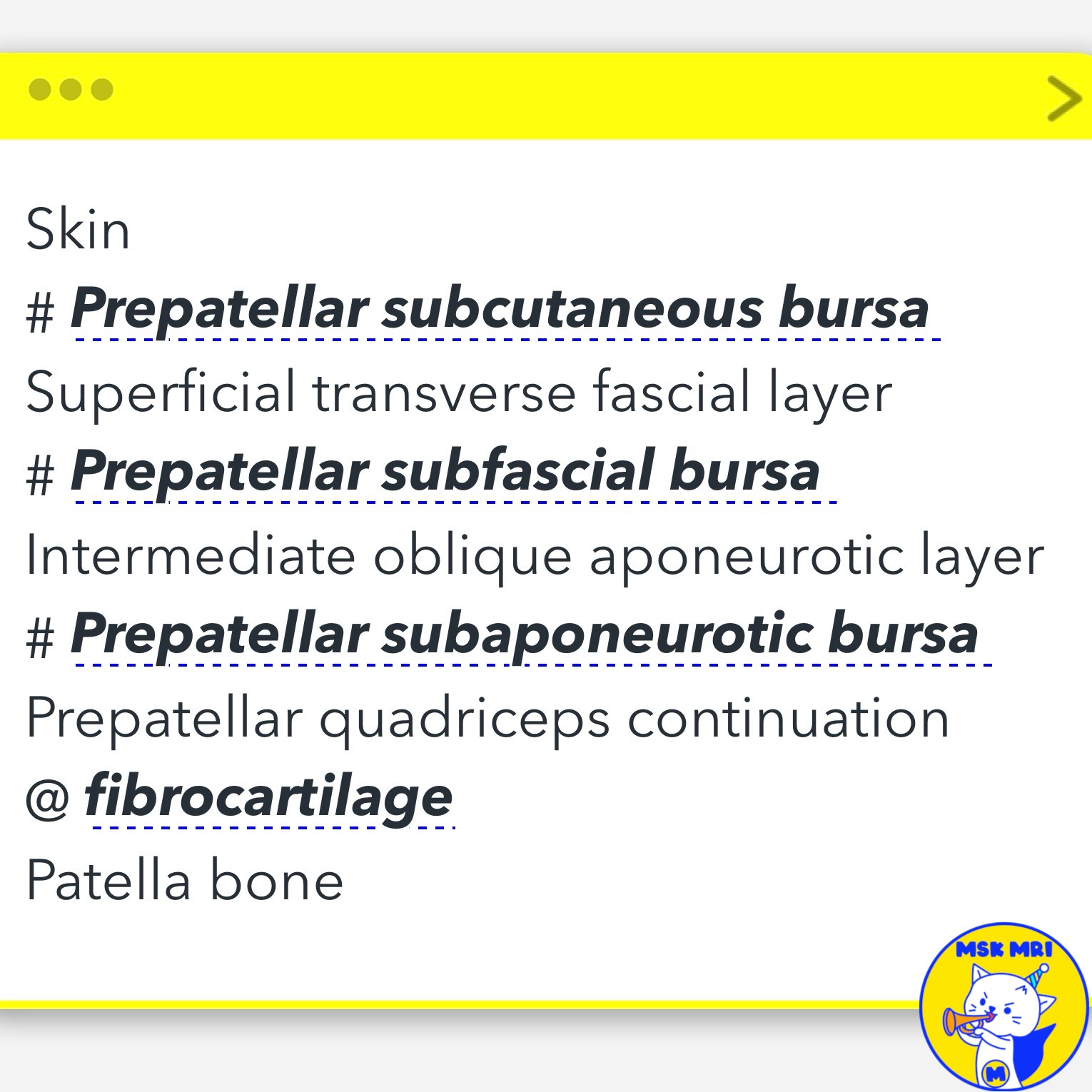 #prepatellarbursa, #kneeanatomy, #bursa, #patella, #imagingfindings, #trilaminararrangement, #subcutaneousbursa, #subfascialbursa, #subaponeurotibursa, #quadricepscontinuation.