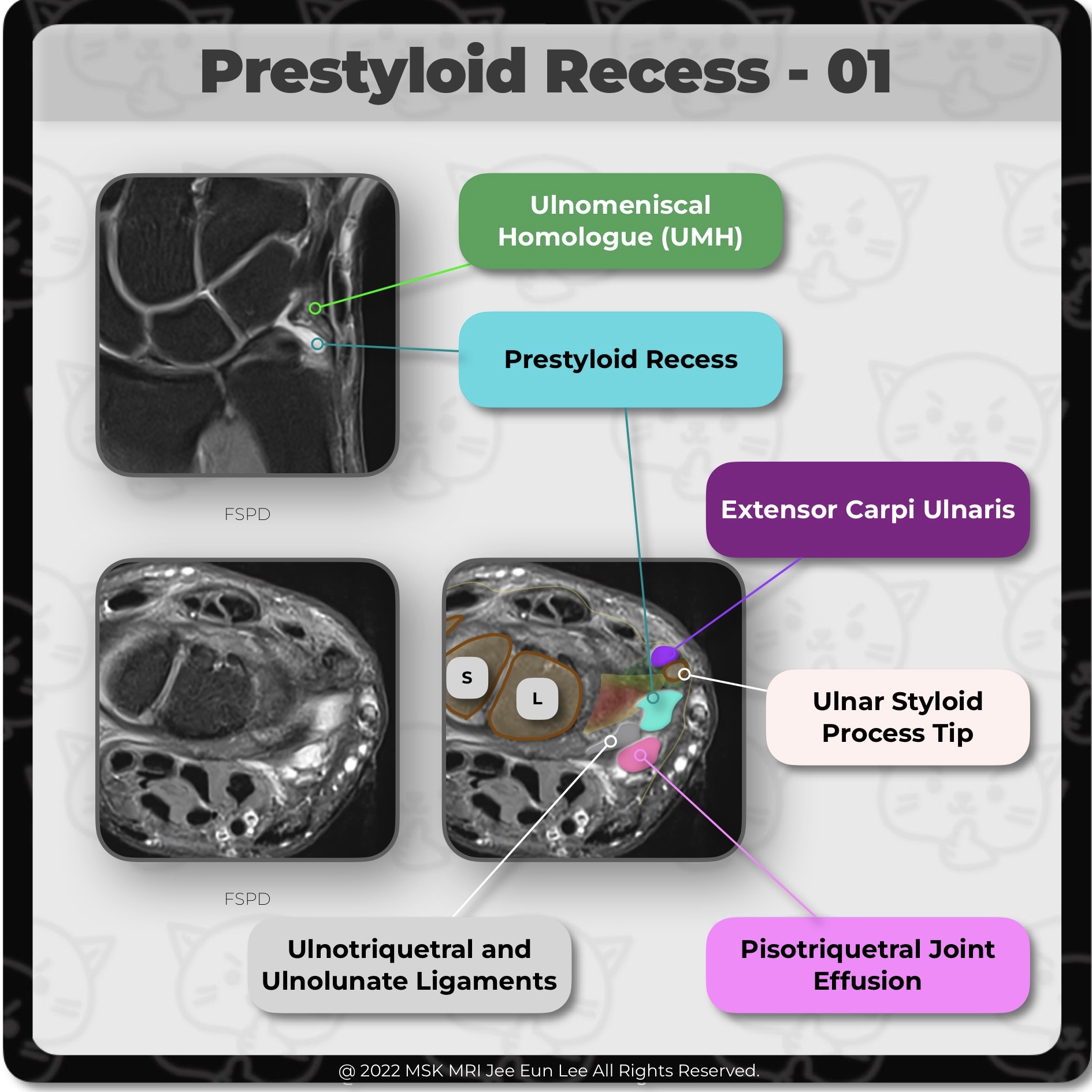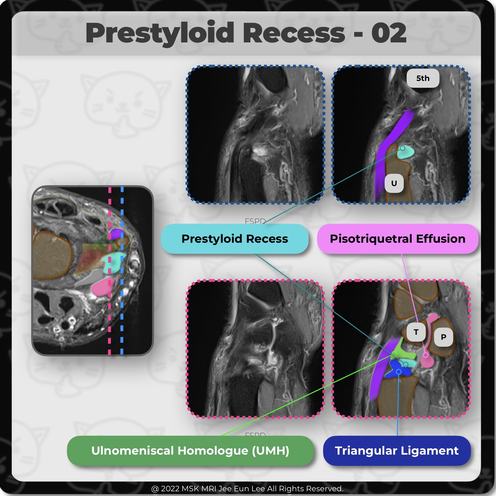 The prestyloid recess is a synovial-lined pouch with a direct connection to the rest of the radiocarpal compartment. It is most commonly a saccular space bordered by the meniscal homologue distally, the TFCC attachments to the ulnar styloid process proximally, and the central TFCC disk radially There are several variations in the shape of the prestyloid recess. Prestyloid recess is best seen on ..